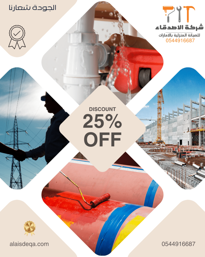 استفد الآن من خصم 25% على جميع خدمات “شركة الأصدقاء للصيانة والبناء”. فرصتك لتحسين وتجميل مساحتك بأسعار لا تقاوم!